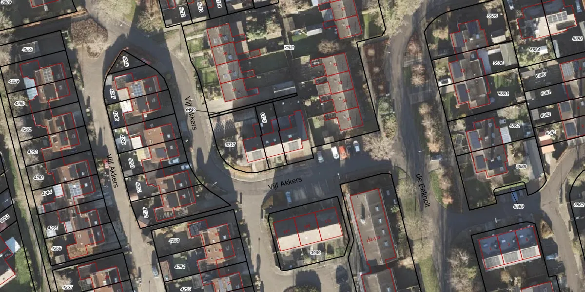 Vijf Akkers 40 is gelegen op kadastraal perceel LEE01H7202. Deze kadastrale aanduiding is uniek en wordt gebruikt door het Kadaster om eigendomsrechten en andere zakelijke rechten vast te leggen. Het perceel maakt onderdeel uit van de kadastrale gemeente Leek.