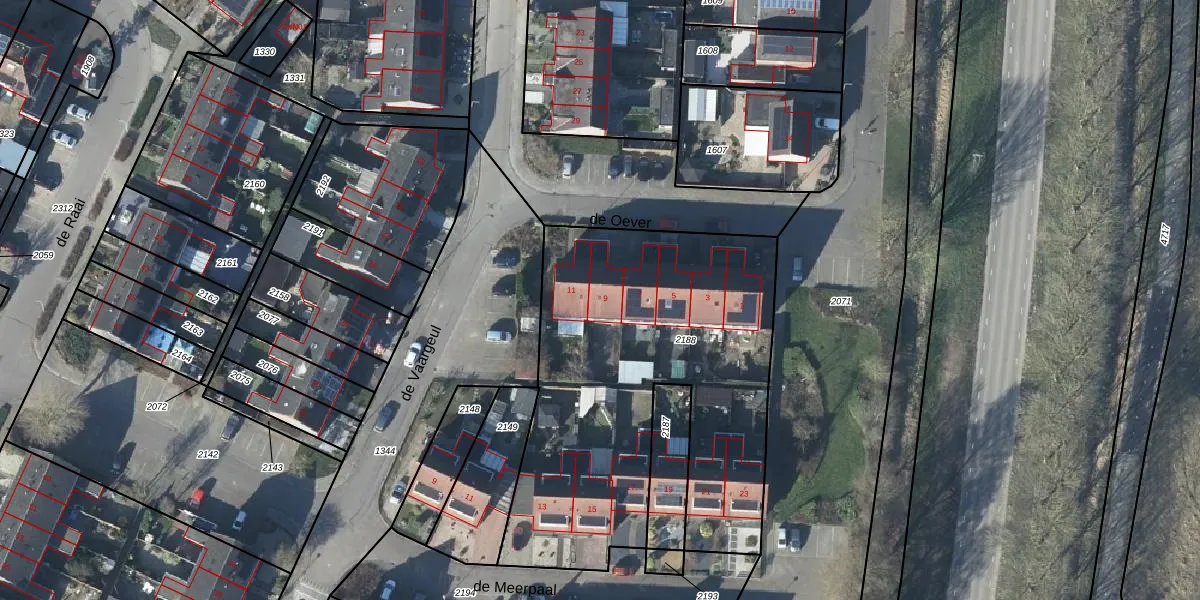 de Oever 9 is gelegen op kadastraal perceel LBH00C2188. Deze kadastrale aanduiding is uniek en wordt gebruikt door het Kadaster om eigendomsrechten en andere zakelijke rechten vast te leggen. Het perceel maakt onderdeel uit van de kadastrale gemeente Lobith en Spijk.