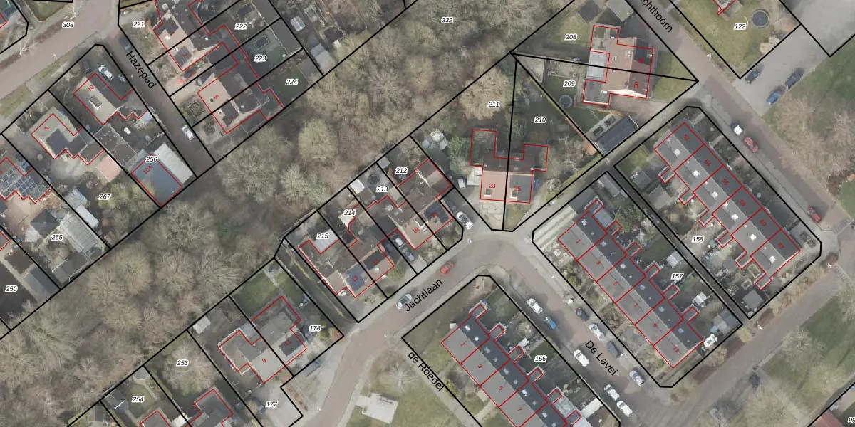 Het perceel waarop Jachtlaan 21 staat heeft een oppervlakte van 230 m². Dit is een middelgroot perceel. De perceeloppervlakte wordt geregistreerd door het Kadaster. Gedetailleerde informatie over de maten van dit perceel kunt u vinden in het rapport Kadastrale kaart met maatvoering van Jachtlaan 21.