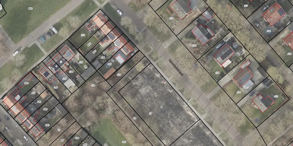 Het perceel waarop Nimrodstraat 12 staat heeft een oppervlakte van 1517 m². Dit is een zeer groot perceel. De perceeloppervlakte wordt geregistreerd door het Kadaster. Gedetailleerde informatie over de maten van dit perceel kunt u vinden in het rapport Kadastrale kaart met maatvoering van Nimrodstraat 12.