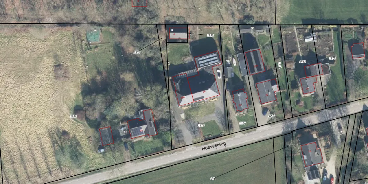 Het perceel waarop Hoevesteeg 26-A staat heeft een oppervlakte van 1900 m². Dit is een zeer groot perceel. De perceeloppervlakte wordt geregistreerd door het Kadaster. Gedetailleerde informatie over de maten van dit perceel kunt u vinden in het rapport Kadastrale kaart met maatvoering van Hoevesteeg 26-A.