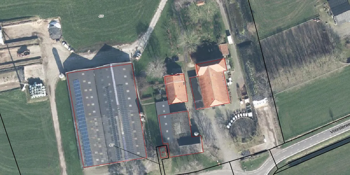 Het perceel waarop Hoevesteeg 4 staat heeft een oppervlakte van 2,5 ha. Dit is een zeer groot perceel. De perceeloppervlakte wordt geregistreerd door het Kadaster. Gedetailleerde informatie over de maten van dit perceel kunt u vinden in het rapport Kadastrale kaart met maatvoering van Hoevesteeg 4.