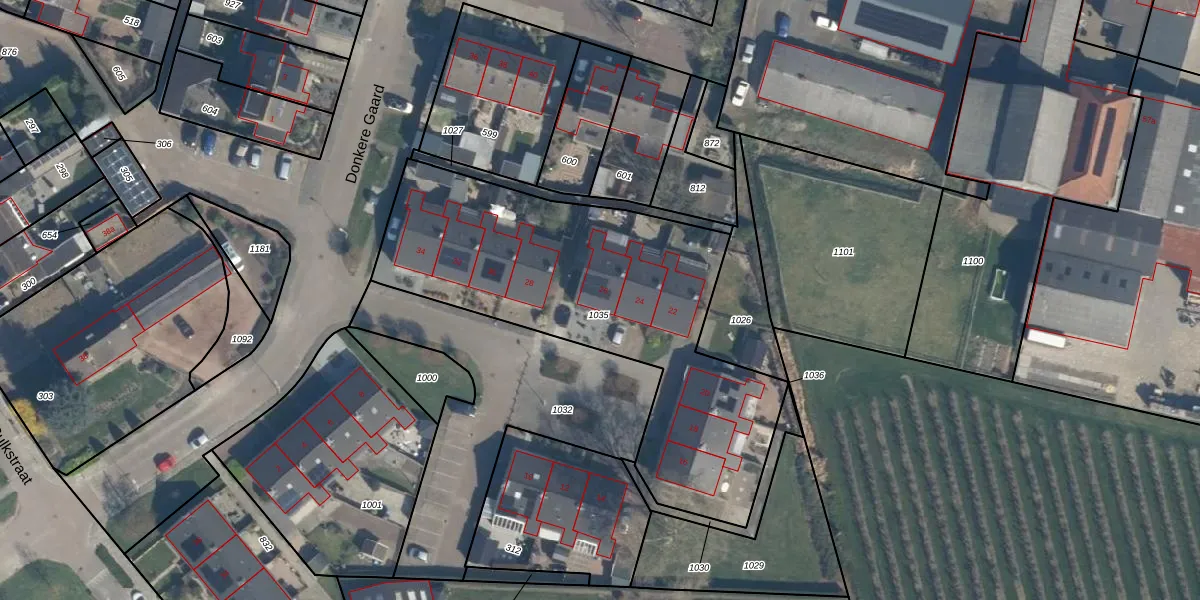 Het perceel waarop Donkere Gaard 26 staat heeft een oppervlakte van 1730 m². Dit is een zeer groot perceel. De perceeloppervlakte wordt geregistreerd door het Kadaster. Gedetailleerde informatie over de maten van dit perceel kunt u vinden in het rapport Kadastrale kaart met maatvoering van Donkere Gaard 26.