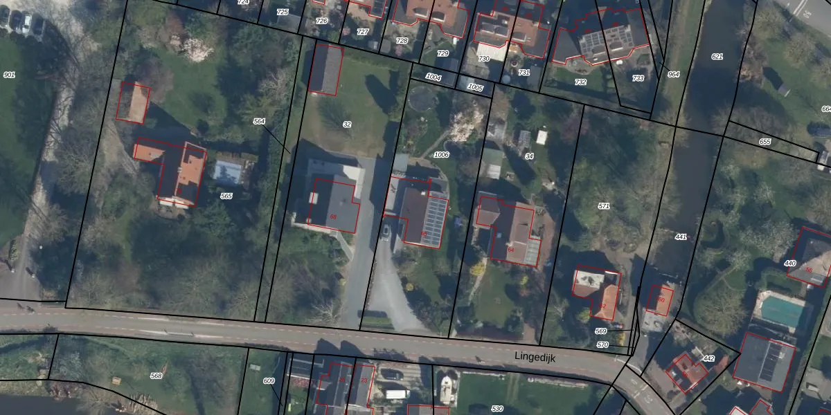 Het perceel waarop Lingedijk 66 staat heeft een oppervlakte van 1250 m². Dit is een zeer groot perceel. De perceeloppervlakte wordt geregistreerd door het Kadaster. Gedetailleerde informatie over de maten van dit perceel kunt u vinden in het rapport Kadastrale kaart met maatvoering van Lingedijk 66.