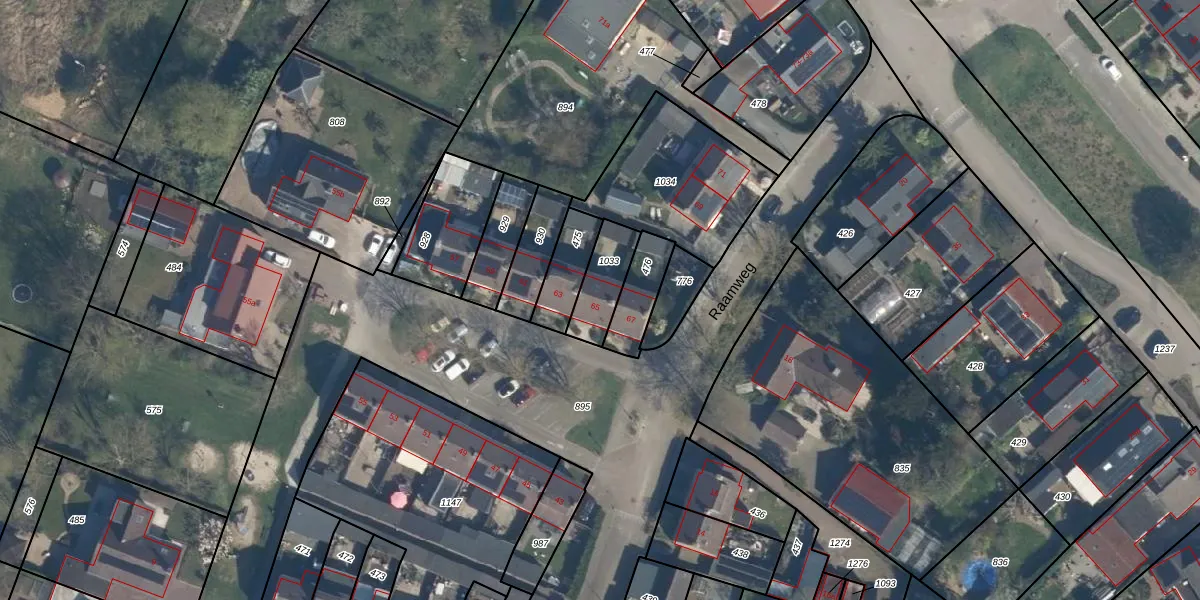 Raamweg 65 is gelegen op kadastraal perceel GDM00K1033. Deze kadastrale aanduiding is uniek en wordt gebruikt door het Kadaster om eigendomsrechten en andere zakelijke rechten vast te leggen. Het perceel maakt onderdeel uit van de kadastrale gemeente Geldermalsen.