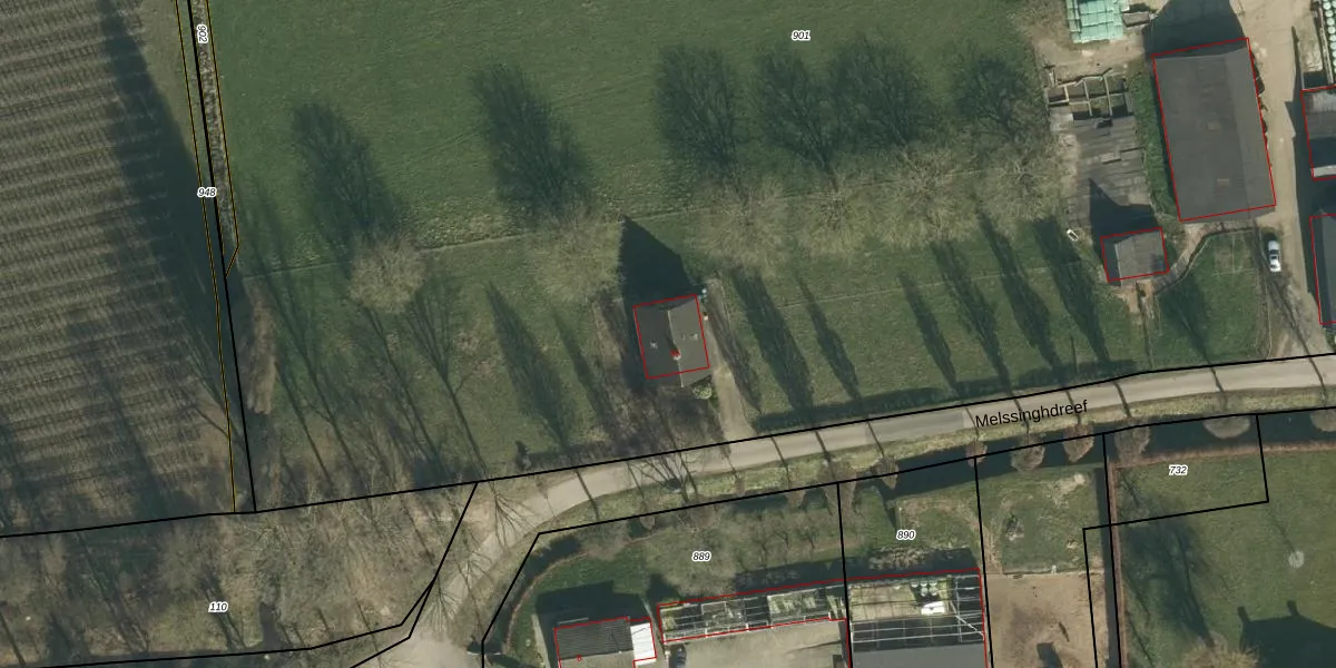 Het perceel waarop Melssinghdreef 3-a staat heeft een oppervlakte van 2,0 ha. Dit is een zeer groot perceel. De perceeloppervlakte wordt geregistreerd door het Kadaster. Gedetailleerde informatie over de maten van dit perceel kunt u vinden in het rapport Kadastrale kaart met maatvoering van Melssinghdreef 3-a.