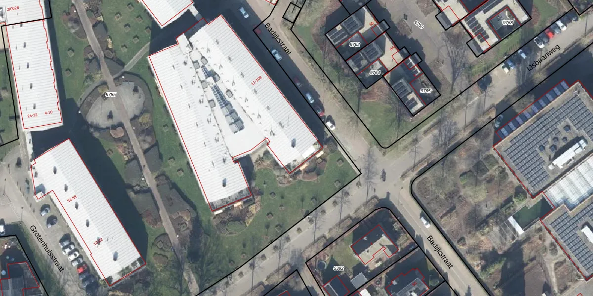 Het perceel waarop Badijkstraat 65 staat heeft een oppervlakte van 1,2 ha. Dit is een zeer groot perceel. De perceeloppervlakte wordt geregistreerd door het Kadaster. Gedetailleerde informatie over de maten van dit perceel kunt u vinden in het rapport Kadastrale kaart met maatvoering van Badijkstraat 65.