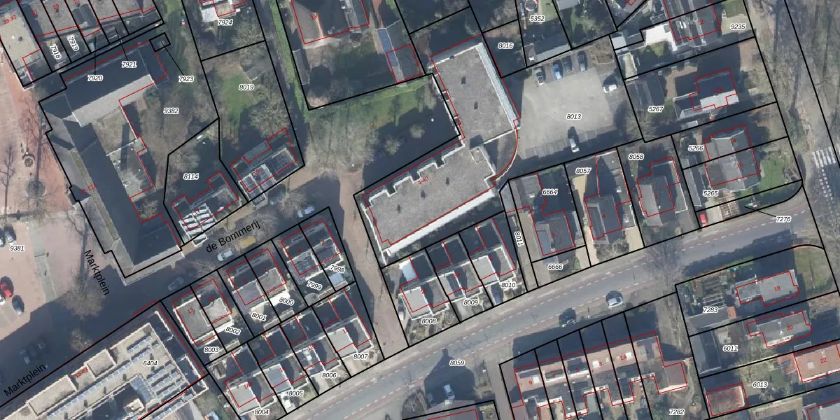 Het perceel waarop de Bommerij 30 staat heeft een oppervlakte van 1870 m². Dit is een zeer groot perceel. De perceeloppervlakte wordt geregistreerd door het Kadaster. Gedetailleerde informatie over de maten van dit perceel kunt u vinden in het rapport Kadastrale kaart met maatvoering van de Bommerij 30.