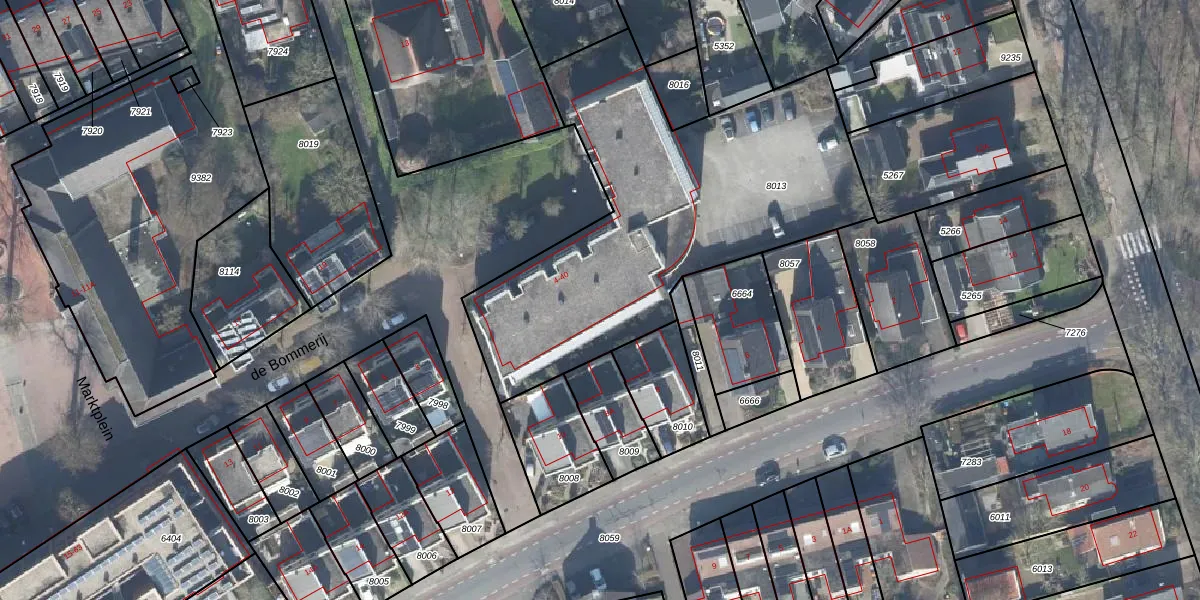 Het perceel waarop de Bommerij 32 staat heeft een oppervlakte van 1870 m². Dit is een zeer groot perceel. De perceeloppervlakte wordt geregistreerd door het Kadaster. Gedetailleerde informatie over de maten van dit perceel kunt u vinden in het rapport Kadastrale kaart met maatvoering van de Bommerij 32.