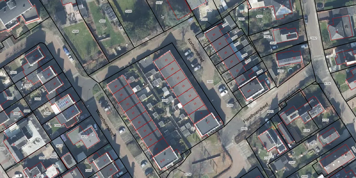 Korhoendreef 15 is gelegen op kadastraal perceel TLO00B7689. Deze kadastrale aanduiding is uniek en wordt gebruikt door het Kadaster om eigendomsrechten en andere zakelijke rechten vast te leggen. Het perceel maakt onderdeel uit van de kadastrale gemeente Twello.