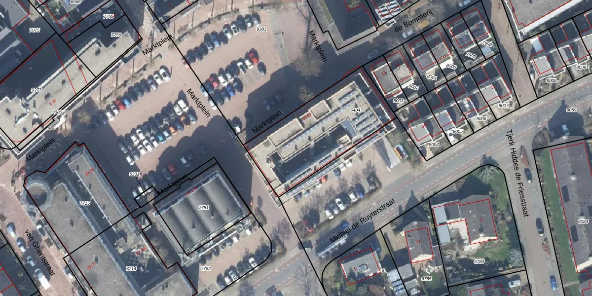 Het perceel waarop Marktplein 23 staat heeft een oppervlakte van 1007 m². Dit is een zeer groot perceel. De perceeloppervlakte wordt geregistreerd door het Kadaster. Gedetailleerde informatie over de maten van dit perceel kunt u vinden in het rapport Kadastrale kaart met maatvoering van Marktplein 23.