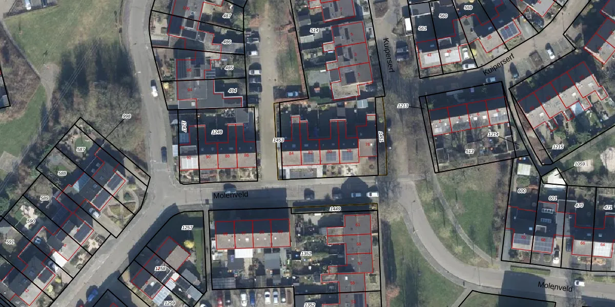 Het perceel waarop Molenveld 82 staat heeft een oppervlakte van 2120 m². Dit is een zeer groot perceel. De perceeloppervlakte wordt geregistreerd door het Kadaster. Gedetailleerde informatie over de maten van dit perceel kunt u vinden in het rapport Kadastrale kaart met maatvoering van Molenveld 82.