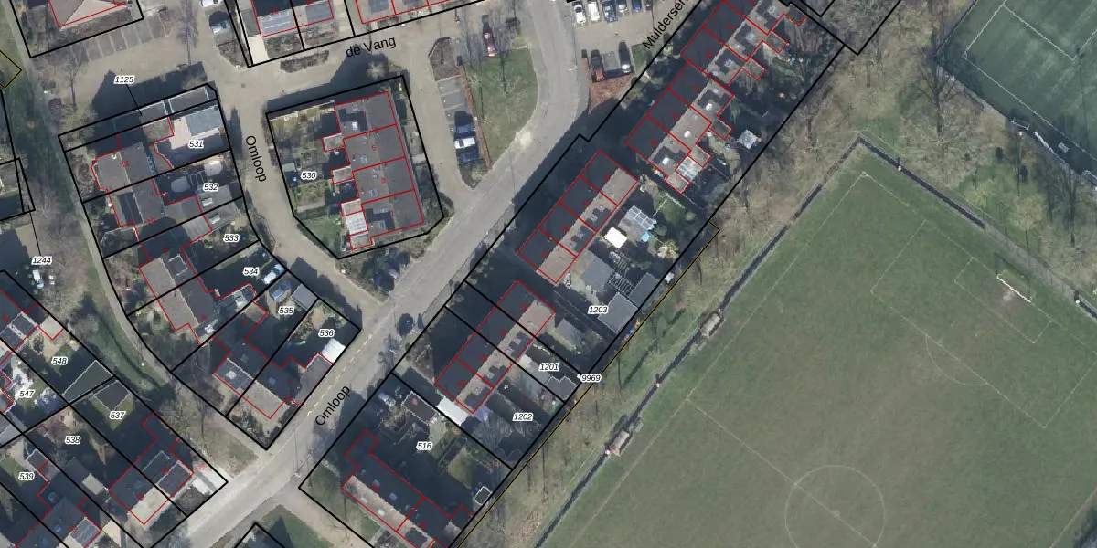 Het perceel waarop Omloop 17 staat heeft een oppervlakte van 2030 m². Dit is een zeer groot perceel. De perceeloppervlakte wordt geregistreerd door het Kadaster. Gedetailleerde informatie over de maten van dit perceel kunt u vinden in het rapport Kadastrale kaart met maatvoering van Omloop 17.