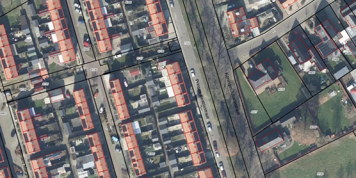 Prinses Beatrixstraat 21 is gelegen op kadastraal perceel TLO00B4355. Deze kadastrale aanduiding is uniek en wordt gebruikt door het Kadaster om eigendomsrechten en andere zakelijke rechten vast te leggen. Het perceel maakt onderdeel uit van de kadastrale gemeente Twello.