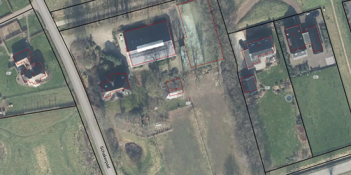 Het perceel waarop Schakerpad 17-0001 staat heeft een oppervlakte van 9725 m². Dit is een zeer groot perceel. De perceeloppervlakte wordt geregistreerd door het Kadaster. Gedetailleerde informatie over de maten van dit perceel kunt u vinden in het rapport Kadastrale kaart met maatvoering van Schakerpad 17-0001.