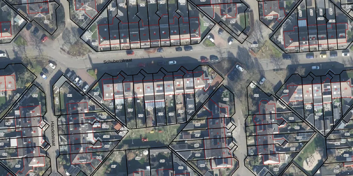 Het perceel waarop Schubertstraat 39 staat heeft een oppervlakte van 173 m². Dit is een middelgroot perceel. De perceeloppervlakte wordt geregistreerd door het Kadaster. Gedetailleerde informatie over de maten van dit perceel kunt u vinden in het rapport Kadastrale kaart met maatvoering van Schubertstraat 39.
