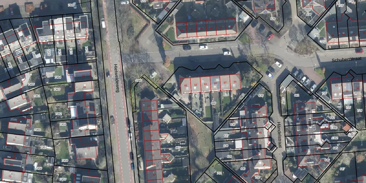 Het perceel waarop Schubertstraat 65 staat heeft een oppervlakte van 1148 m². Dit is een zeer groot perceel. De perceeloppervlakte wordt geregistreerd door het Kadaster. Gedetailleerde informatie over de maten van dit perceel kunt u vinden in het rapport Kadastrale kaart met maatvoering van Schubertstraat 65.