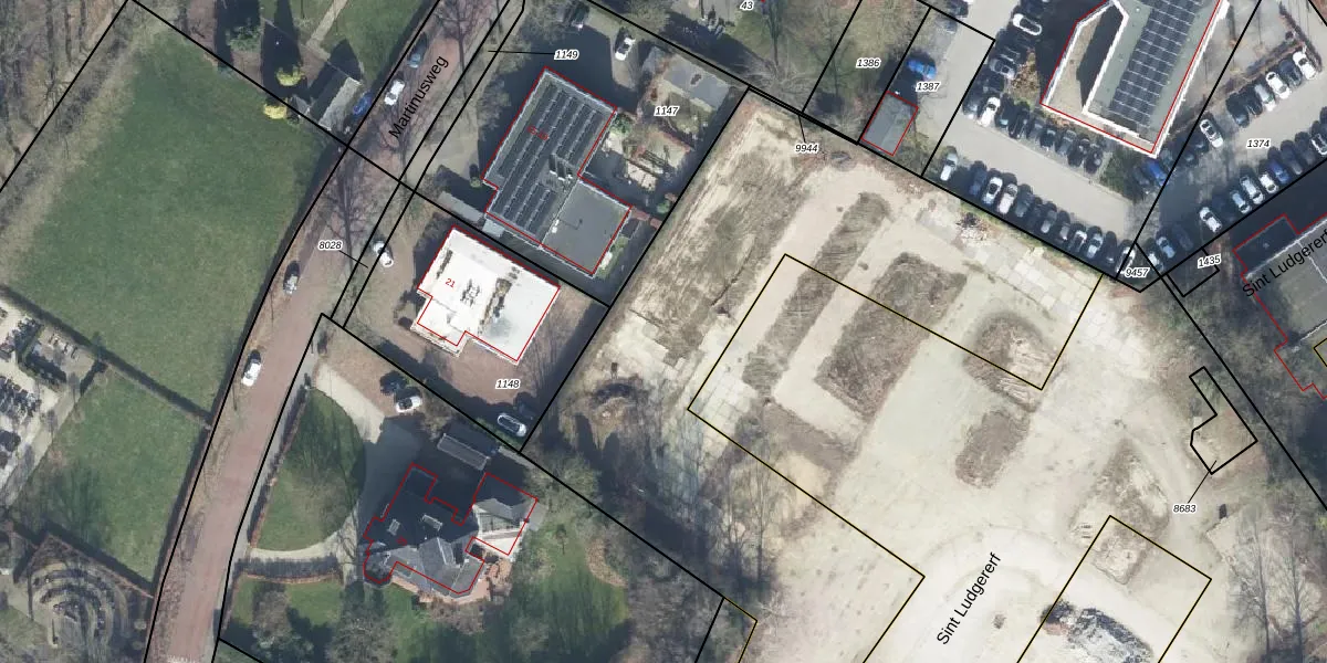 Het perceel waarop Sint Ludgererf 22 staat heeft een oppervlakte van 3708 m². Dit is een zeer groot perceel. De perceeloppervlakte wordt geregistreerd door het Kadaster. Gedetailleerde informatie over de maten van dit perceel kunt u vinden in het rapport Kadastrale kaart met maatvoering van Sint Ludgererf 22.