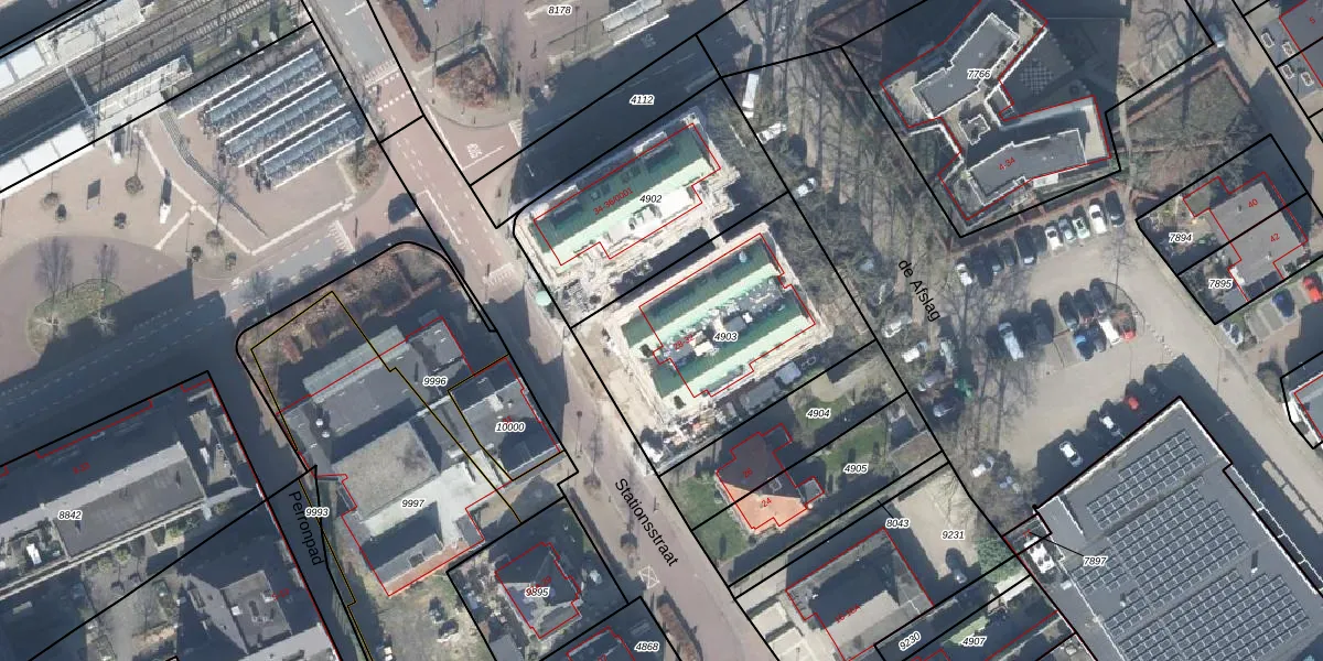 Het perceel waarop Stationsstraat 30 staat heeft een oppervlakte van 1005 m². Dit is een zeer groot perceel. De perceeloppervlakte wordt geregistreerd door het Kadaster. Gedetailleerde informatie over de maten van dit perceel kunt u vinden in het rapport Kadastrale kaart met maatvoering van Stationsstraat 30.