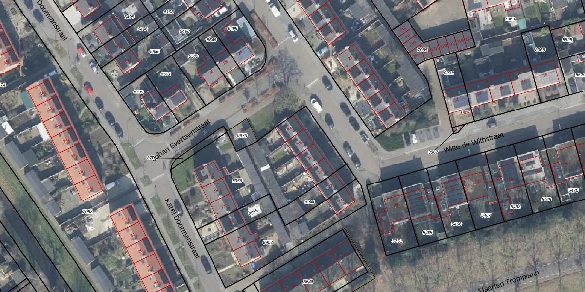 Witte de Withstraat 16 is gelegen op kadastraal perceel TLO00B8956. Deze kadastrale aanduiding is uniek en wordt gebruikt door het Kadaster om eigendomsrechten en andere zakelijke rechten vast te leggen. Het perceel maakt onderdeel uit van de kadastrale gemeente Twello.
