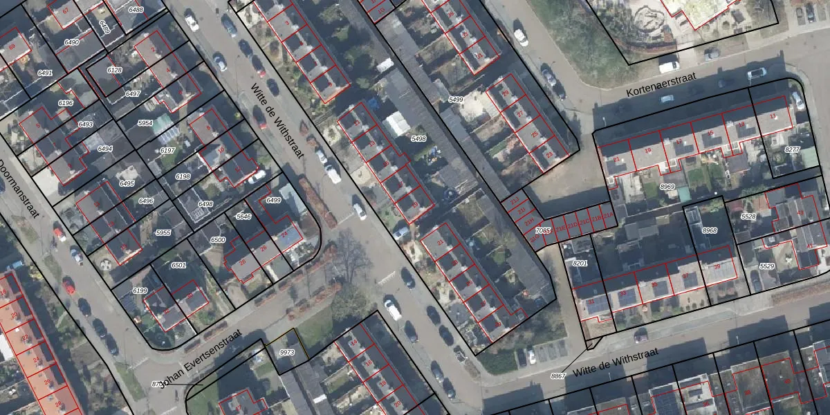 Het perceel waarop Witte de Withstraat 19 staat heeft een oppervlakte van 2605 m². Dit is een zeer groot perceel. De perceeloppervlakte wordt geregistreerd door het Kadaster. Gedetailleerde informatie over de maten van dit perceel kunt u vinden in het rapport Kadastrale kaart met maatvoering van Witte de Withstraat 19.