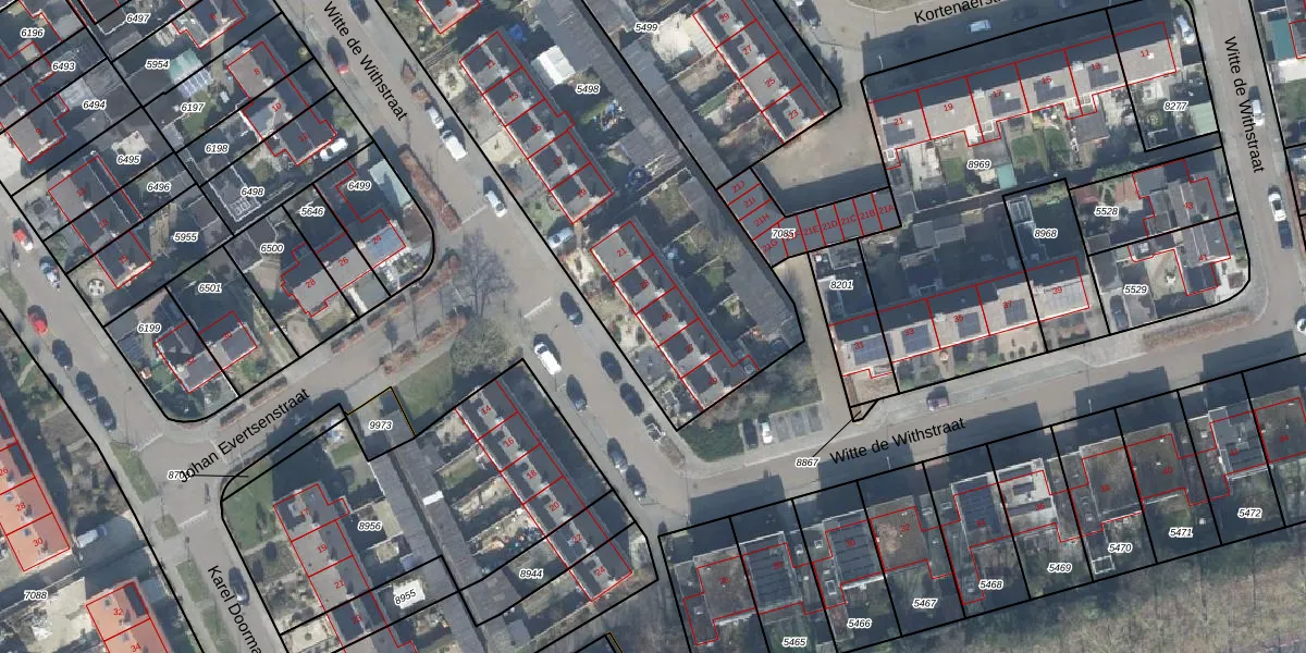 Het perceel waarop Witte de Withstraat 25 staat heeft een oppervlakte van 2605 m². Dit is een zeer groot perceel. De perceeloppervlakte wordt geregistreerd door het Kadaster. Gedetailleerde informatie over de maten van dit perceel kunt u vinden in het rapport Kadastrale kaart met maatvoering van Witte de Withstraat 25.