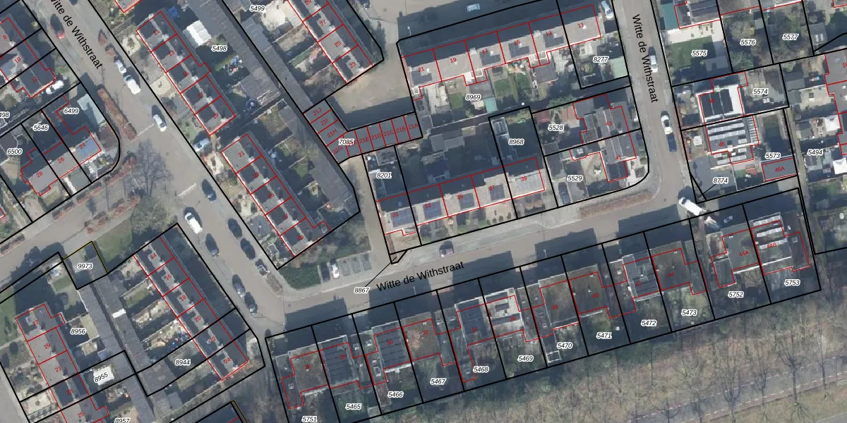 Het perceel waarop Witte de Withstraat 33 staat heeft een oppervlakte van 1548 m². Dit is een zeer groot perceel. De perceeloppervlakte wordt geregistreerd door het Kadaster. Gedetailleerde informatie over de maten van dit perceel kunt u vinden in het rapport Kadastrale kaart met maatvoering van Witte de Withstraat 33.