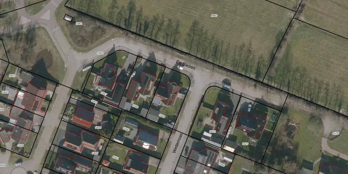 Het perceel waarop De Biezen 6 staat heeft een oppervlakte van 530 m². Dit is een groot perceel. De perceeloppervlakte wordt geregistreerd door het Kadaster. Gedetailleerde informatie over de maten van dit perceel kunt u vinden in het rapport Kadastrale kaart met maatvoering van De Biezen 6.