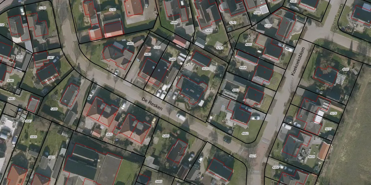Het perceel waarop De Resken 2 staat heeft een oppervlakte van 825 m². Dit is een groot perceel. De perceeloppervlakte wordt geregistreerd door het Kadaster. Gedetailleerde informatie over de maten van dit perceel kunt u vinden in het rapport Kadastrale kaart met maatvoering van De Resken 2.