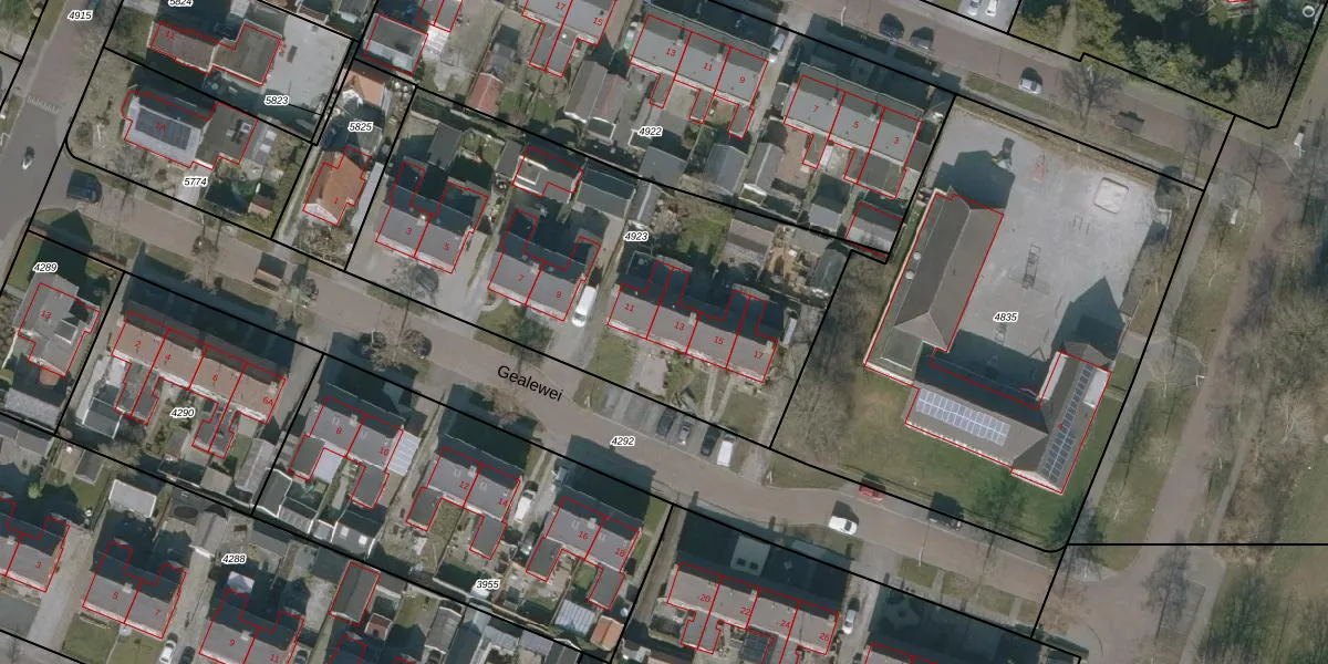 Het perceel waarop Gealewei 13 staat heeft een oppervlakte van 2162 m². Dit is een zeer groot perceel. De perceeloppervlakte wordt geregistreerd door het Kadaster. Gedetailleerde informatie over de maten van dit perceel kunt u vinden in het rapport Kadastrale kaart met maatvoering van Gealewei 13.