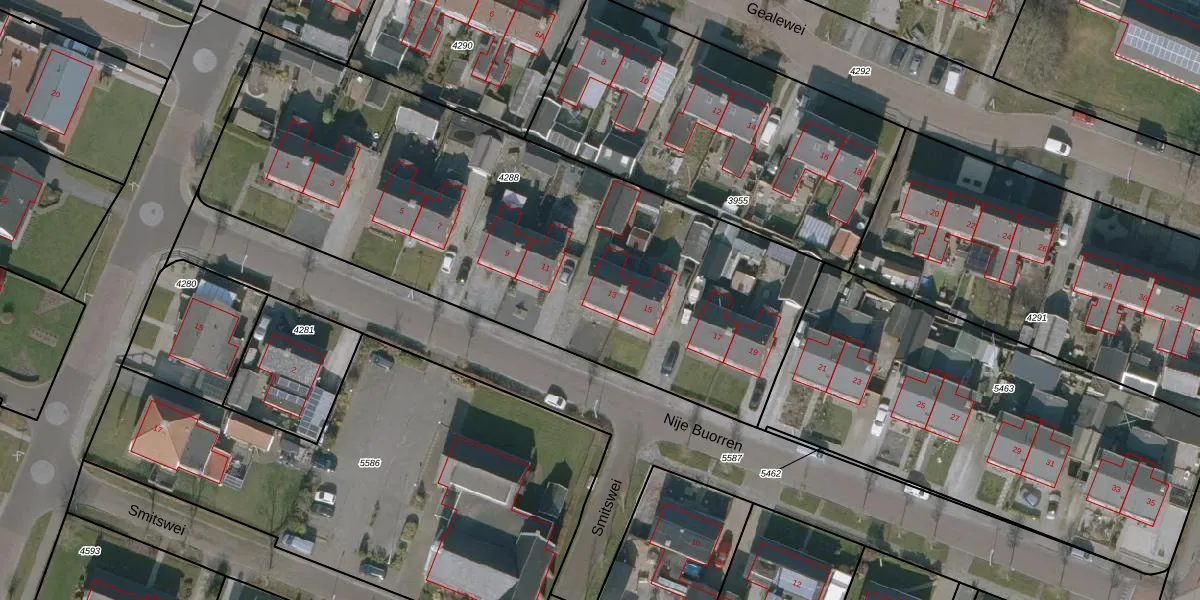 Het perceel waarop Nije Buorren 13 staat heeft een oppervlakte van 3025 m². Dit is een zeer groot perceel. De perceeloppervlakte wordt geregistreerd door het Kadaster. Gedetailleerde informatie over de maten van dit perceel kunt u vinden in het rapport Kadastrale kaart met maatvoering van Nije Buorren 13.