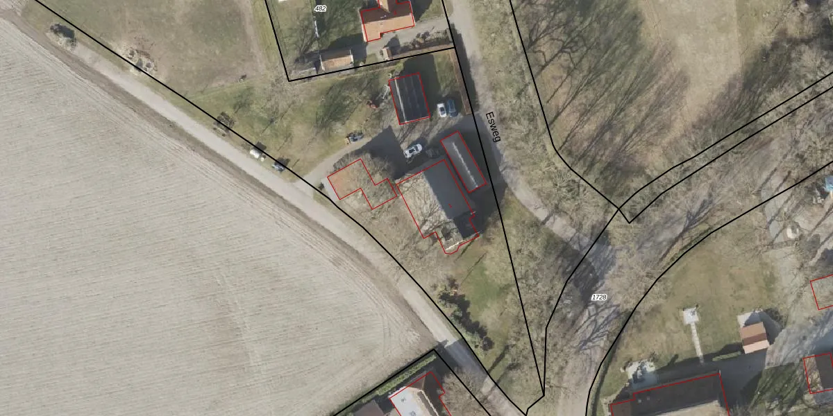 Esweg 1 is gelegen op kadastraal perceel VRI00V1040. Deze kadastrale aanduiding is uniek en wordt gebruikt door het Kadaster om eigendomsrechten en andere zakelijke rechten vast te leggen. Het perceel maakt onderdeel uit van de kadastrale gemeente Vries.