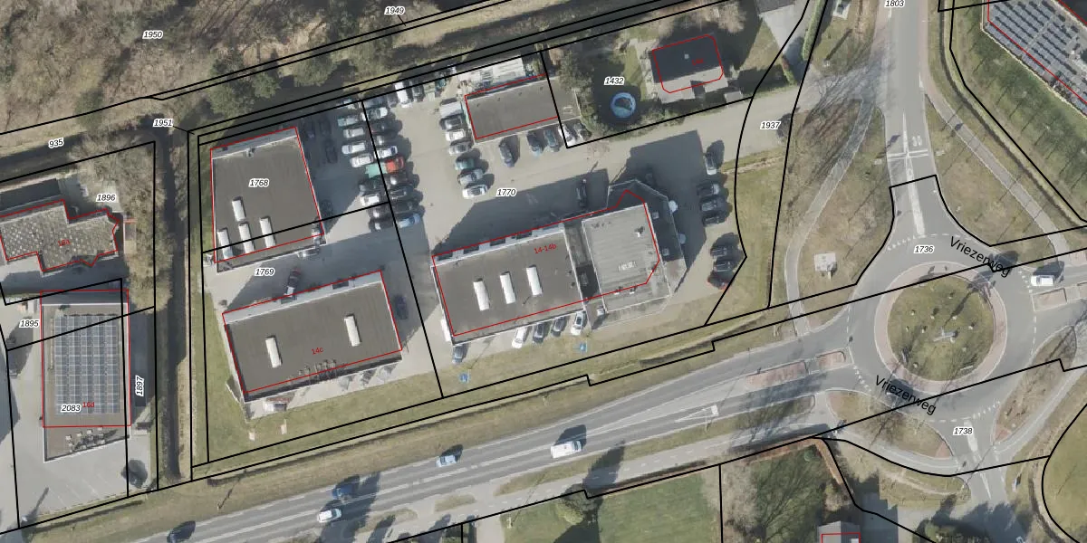 Vriezerweg 14 is gelegen op kadastraal perceel VRI00V1770. Deze kadastrale aanduiding is uniek en wordt gebruikt door het Kadaster om eigendomsrechten en andere zakelijke rechten vast te leggen. Het perceel maakt onderdeel uit van de kadastrale gemeente Vries.