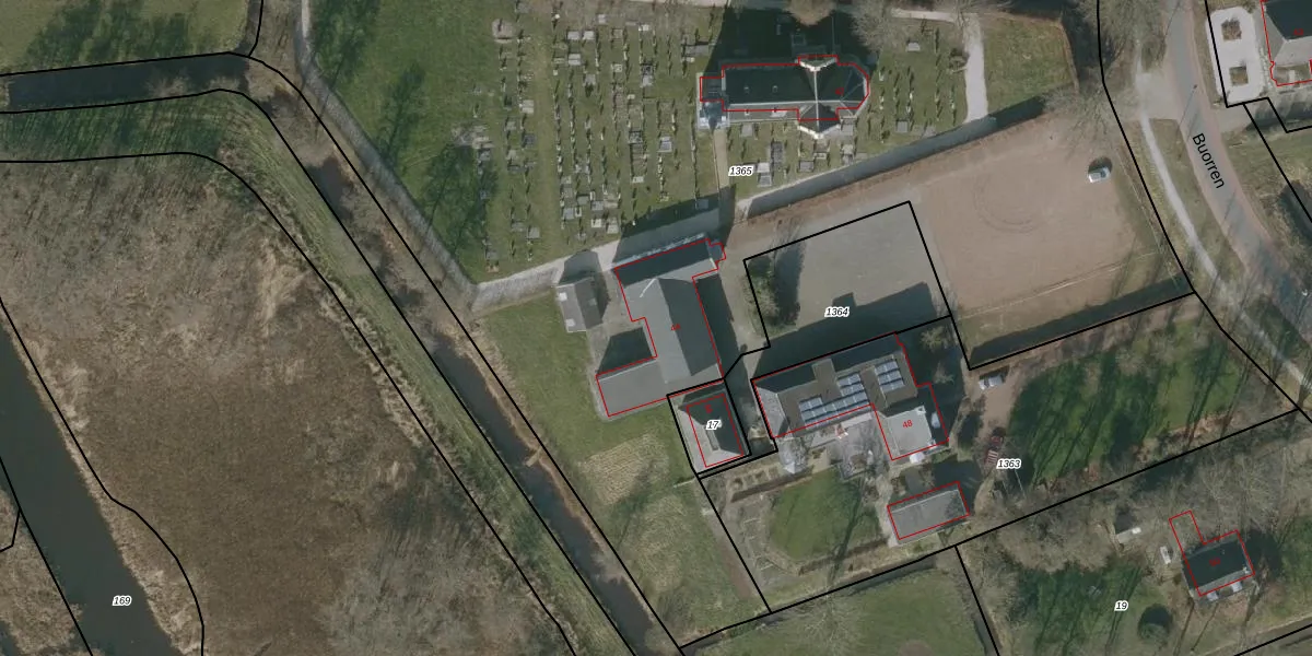 Het perceel waarop Buorren 44 staat heeft een oppervlakte van 7625 m². Dit is een zeer groot perceel. De perceeloppervlakte wordt geregistreerd door het Kadaster. Gedetailleerde informatie over de maten van dit perceel kunt u vinden in het rapport Kadastrale kaart met maatvoering van Buorren 44.