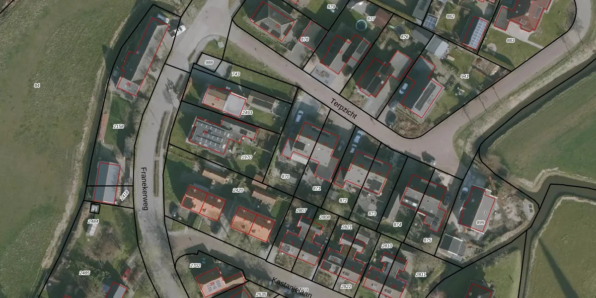 Terpzicht 19 is gelegen op kadastraal perceel TJU00D870. Deze kadastrale aanduiding is uniek en wordt gebruikt door het Kadaster om eigendomsrechten en andere zakelijke rechten vast te leggen. Het perceel maakt onderdeel uit van de kadastrale gemeente Tjum.