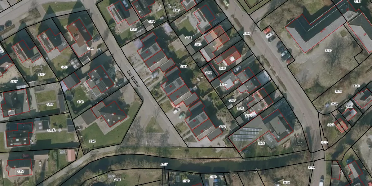 Het perceel waarop De Buffer 32 staat heeft een oppervlakte van 2079 m². Dit is een zeer groot perceel. De perceeloppervlakte wordt geregistreerd door het Kadaster. Gedetailleerde informatie over de maten van dit perceel kunt u vinden in het rapport Kadastrale kaart met maatvoering van De Buffer 32.