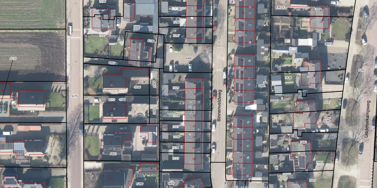 Het perceel waarop Binnenveldweg 35 staat heeft een oppervlakte van 562 m². Dit is een groot perceel. De perceeloppervlakte wordt geregistreerd door het Kadaster. Gedetailleerde informatie over de maten van dit perceel kunt u vinden in het rapport Kadastrale kaart met maatvoering van Binnenveldweg 35.