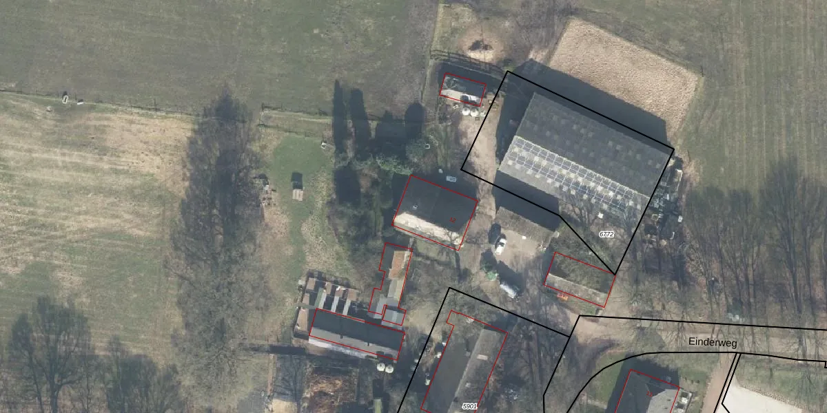 Het perceel waarop Einderweg 12 staat heeft een oppervlakte van 10,6 ha. Dit is een zeer groot perceel. De perceeloppervlakte wordt geregistreerd door het Kadaster. Gedetailleerde informatie over de maten van dit perceel kunt u vinden in het rapport Kadastrale kaart met maatvoering van Einderweg 12.