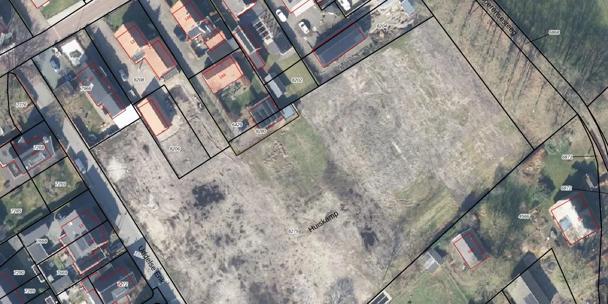 Het perceel waarop Huiskamp 7 staat heeft een oppervlakte van 8419 m². Dit is een zeer groot perceel. De perceeloppervlakte wordt geregistreerd door het Kadaster. Gedetailleerde informatie over de maten van dit perceel kunt u vinden in het rapport Kadastrale kaart met maatvoering van Huiskamp 7.
