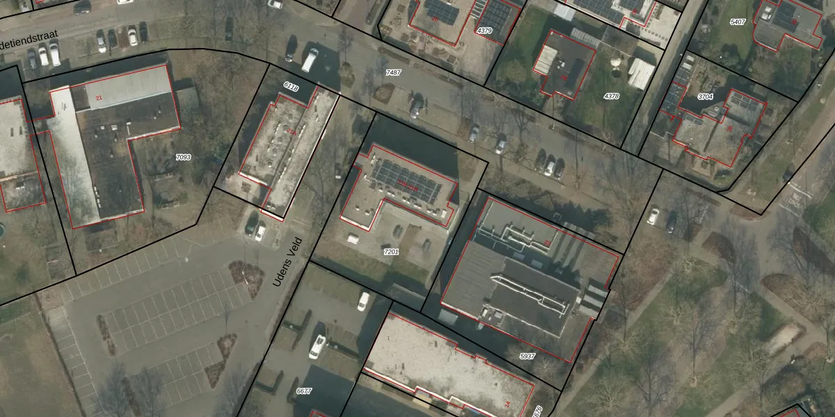 Aldetiendstraat 21-E is gelegen op kadastraal perceel UDN00M7201. Deze kadastrale aanduiding is uniek en wordt gebruikt door het Kadaster om eigendomsrechten en andere zakelijke rechten vast te leggen. Het perceel maakt onderdeel uit van de kadastrale gemeente Uden.