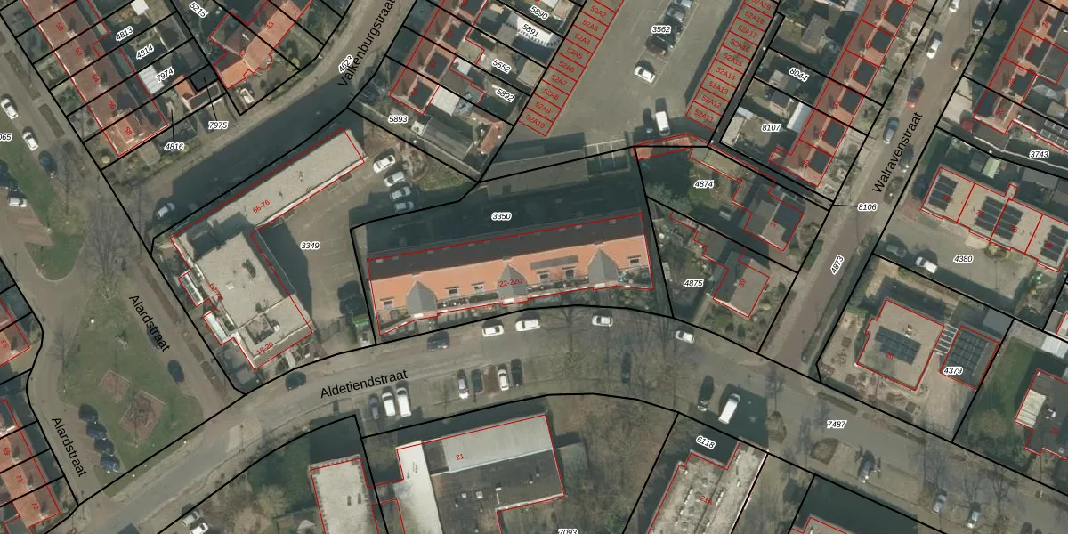 Het perceel waarop Aldetiendstraat 22-G staat heeft een oppervlakte van 1415 m². Dit is een zeer groot perceel. De perceeloppervlakte wordt geregistreerd door het Kadaster. Gedetailleerde informatie over de maten van dit perceel kunt u vinden in het rapport Kadastrale kaart met maatvoering van Aldetiendstraat 22-G.