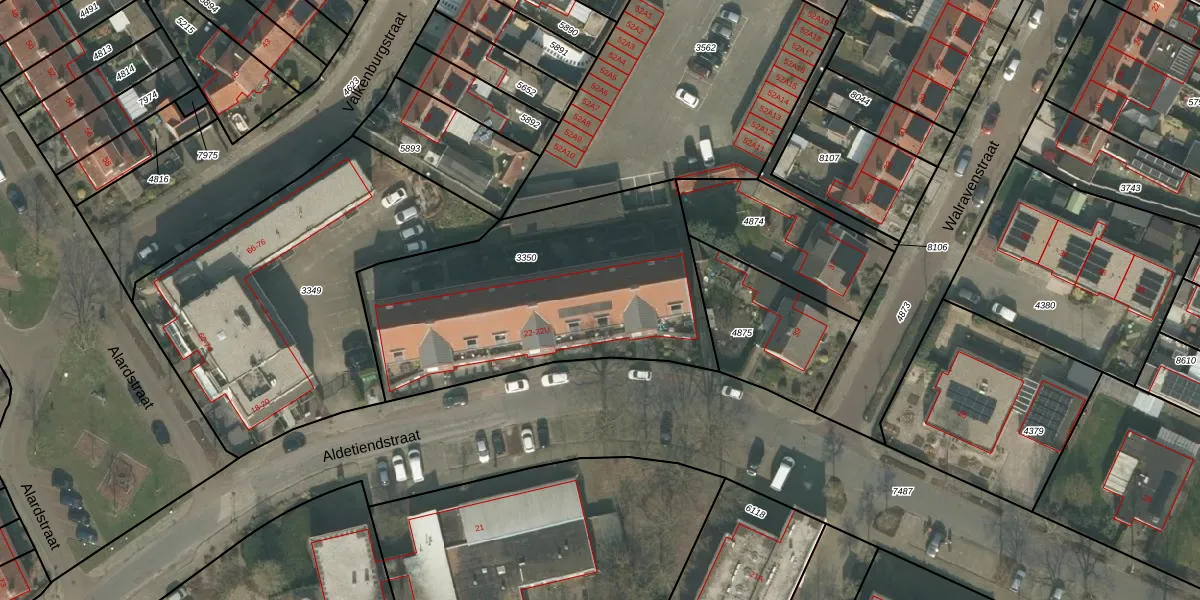 Het perceel waarop Aldetiendstraat 22-R staat heeft een oppervlakte van 1415 m². Dit is een zeer groot perceel. De perceeloppervlakte wordt geregistreerd door het Kadaster. Gedetailleerde informatie over de maten van dit perceel kunt u vinden in het rapport Kadastrale kaart met maatvoering van Aldetiendstraat 22-R.