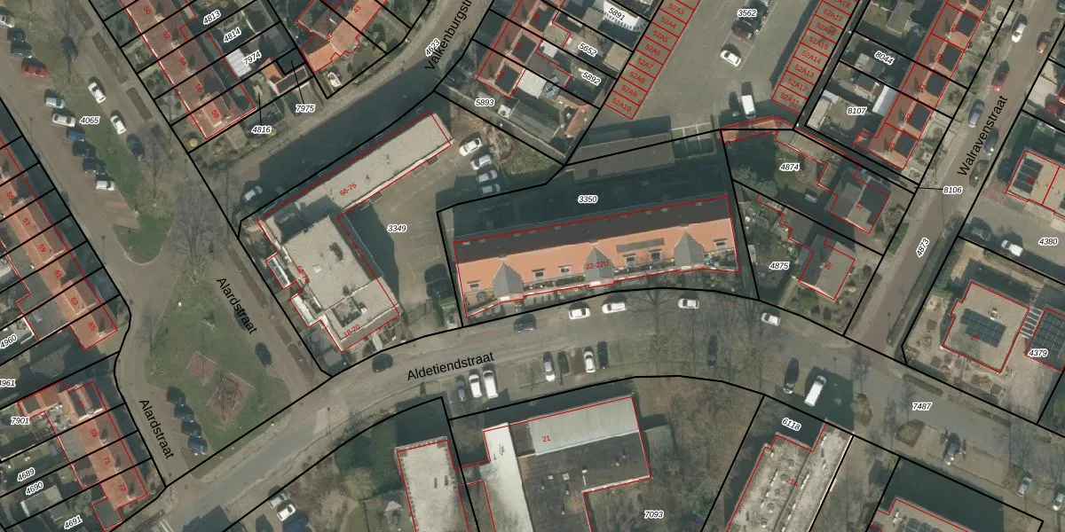 Het perceel waarop Aldetiendstraat 22-A staat heeft een oppervlakte van 1415 m². Dit is een zeer groot perceel. De perceeloppervlakte wordt geregistreerd door het Kadaster. Gedetailleerde informatie over de maten van dit perceel kunt u vinden in het rapport Kadastrale kaart met maatvoering van Aldetiendstraat 22-A.