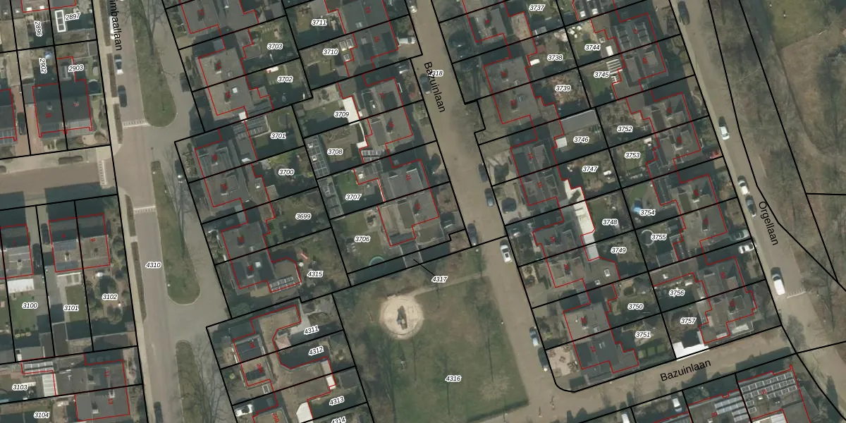 Het perceel waarop Bazuinlaan 23 staat heeft een oppervlakte van 387 m². Dit is een groot perceel. De perceeloppervlakte wordt geregistreerd door het Kadaster. Gedetailleerde informatie over de maten van dit perceel kunt u vinden in het rapport Kadastrale kaart met maatvoering van Bazuinlaan 23.