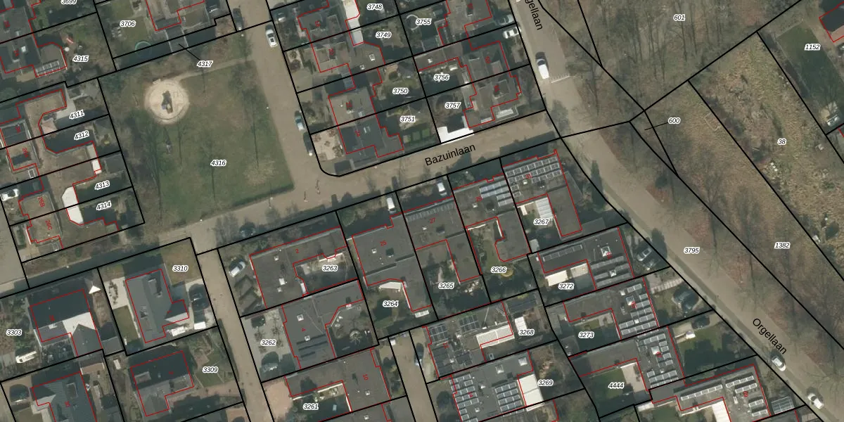 Het perceel waarop Bazuinlaan 27 staat heeft een oppervlakte van 420 m². Dit is een groot perceel. De perceeloppervlakte wordt geregistreerd door het Kadaster. Gedetailleerde informatie over de maten van dit perceel kunt u vinden in het rapport Kadastrale kaart met maatvoering van Bazuinlaan 27.