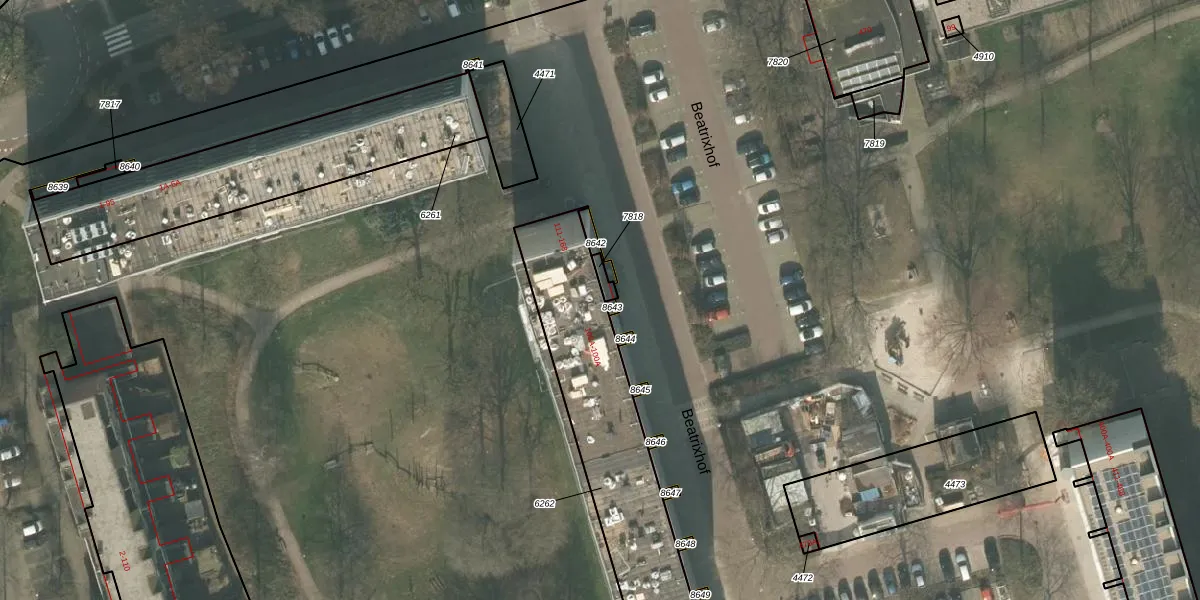 Het perceel waarop Beatrixhof 112 staat heeft een oppervlakte van 843 m². Dit is een groot perceel. De perceeloppervlakte wordt geregistreerd door het Kadaster. Gedetailleerde informatie over de maten van dit perceel kunt u vinden in het rapport Kadastrale kaart met maatvoering van Beatrixhof 112.