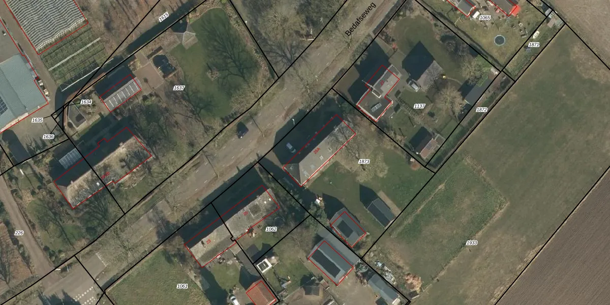 Het perceel waarop Bedafseweg 25-A staat heeft een oppervlakte van 1605 m². Dit is een zeer groot perceel. De perceeloppervlakte wordt geregistreerd door het Kadaster. Gedetailleerde informatie over de maten van dit perceel kunt u vinden in het rapport Kadastrale kaart met maatvoering van Bedafseweg 25-A.