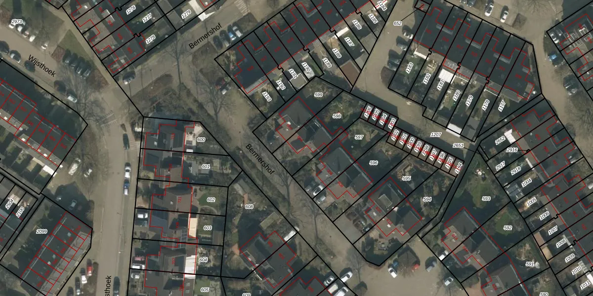 Het perceel waarop Bermershof 604 staat heeft een oppervlakte van 345 m². Dit is een groot perceel. De perceeloppervlakte wordt geregistreerd door het Kadaster. Gedetailleerde informatie over de maten van dit perceel kunt u vinden in het rapport Kadastrale kaart met maatvoering van Bermershof 604.