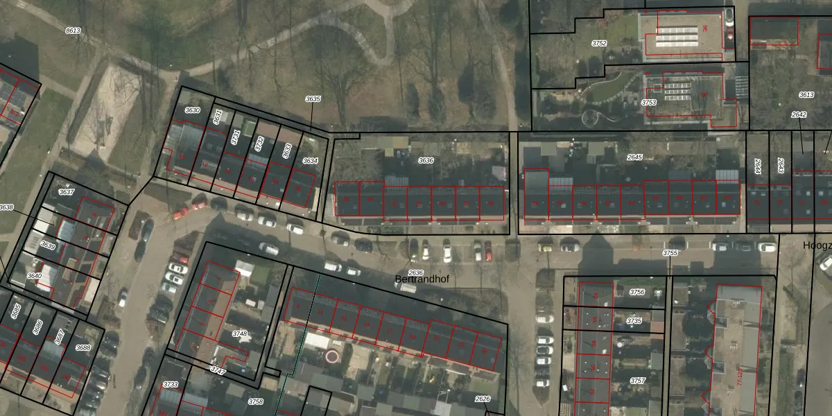 Het perceel waarop Bertrandhof 28 staat heeft een oppervlakte van 1050 m². Dit is een zeer groot perceel. De perceeloppervlakte wordt geregistreerd door het Kadaster. Gedetailleerde informatie over de maten van dit perceel kunt u vinden in het rapport Kadastrale kaart met maatvoering van Bertrandhof 28.