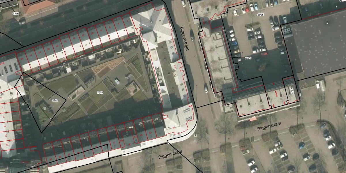 Het perceel waarop Biggenstraat 49 staat heeft een oppervlakte van 8022 m². Dit is een zeer groot perceel. De perceeloppervlakte wordt geregistreerd door het Kadaster. Gedetailleerde informatie over de maten van dit perceel kunt u vinden in het rapport Kadastrale kaart met maatvoering van Biggenstraat 49.